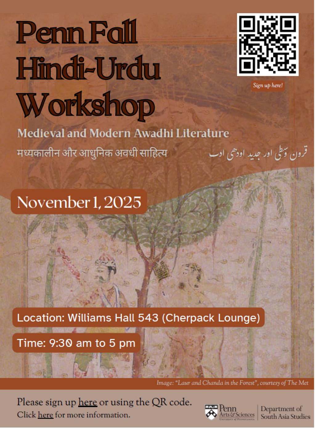 The University of Pennsylvania is organizing a Hindi-Urdu workshop dedicated to exploring the richness of medieval and modern Awadhi literary traditions. During this workshop, Dr. Timsal Masud and Dr. Aftab Ahmad will lead a close reading of a 19th-century Awadhi marsiya by Khaleefa Muhammad Ali Sikandar, offering insights into its linguistic, cultural, and poetic dimensions. The workshop is free and open to all. The goal is to foster a collaborative, cross-scriptural atmosphere where participants of all skill levels engage with shared literary and cultural concerns. All texts will be available in Devanagari script with transliteration. Use the QR code to sign up.